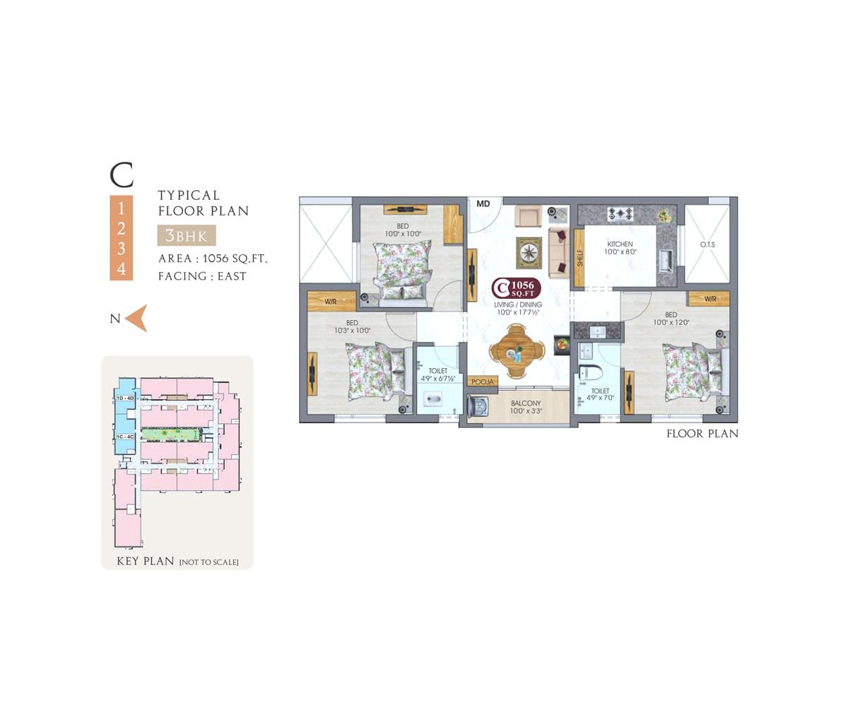 • Concealed 3 Phase electricity supply with Finolex / Anchor or equivalent.