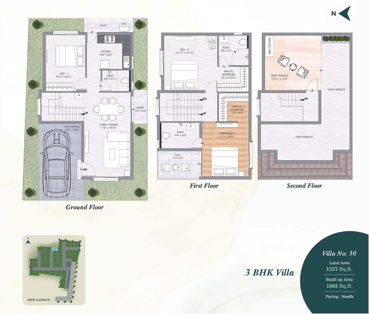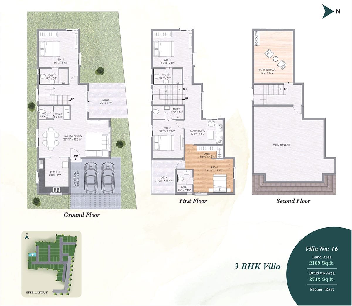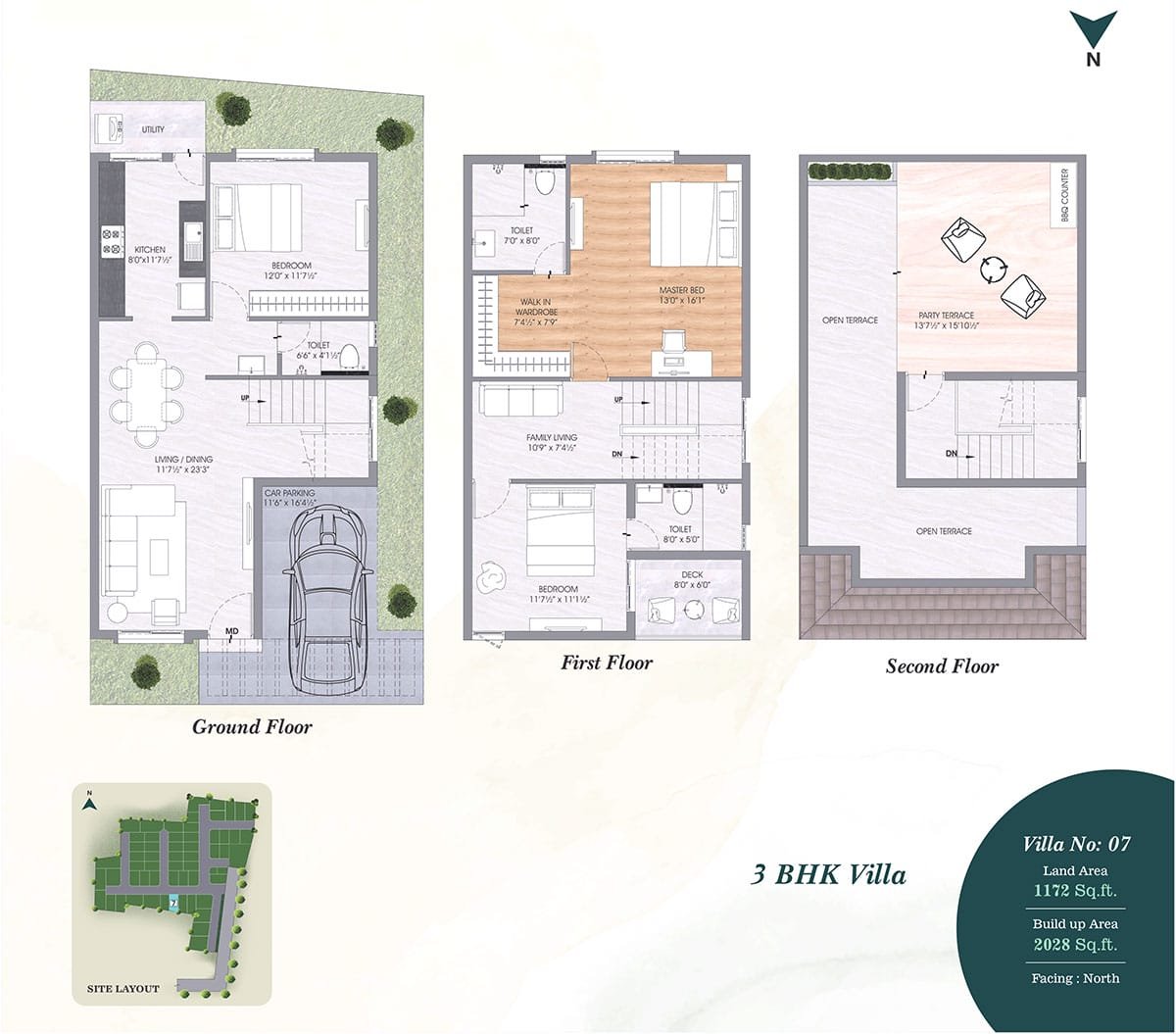 • Terrace-Weather proof tiles and 200MM X 1200MM wooden pattern vitrified tiles with spacers in Party Terrace.